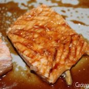 Mientras se cocina vamos echando un chorrito de la salsa teriyaki por encima que con el calor se irá caramelizando ligeramente. Cuando veamos que más o menos la piel está dorada lo giramos con cuidado para cocinarlo más por la parte de la carne pero es mejor que no se quede mucho más tiempo.