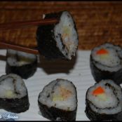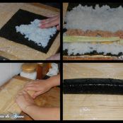 7º colocamos una lamina de nori en la esterilla,con la parte brillante hacia abajo, luego pondríamos el arroz y por ultimo los ingredientes ( yo los hice con varios ingredientes en la foto lleva pepino,atún y salsa rosa).