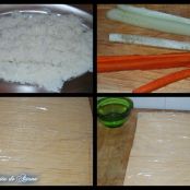 6º cogemos una esterilla y la vamos a forrar con papel film, también cogeremos un recipiente con agua para que no se nos pegue el arroz en la manos y podamos trabajar mejor