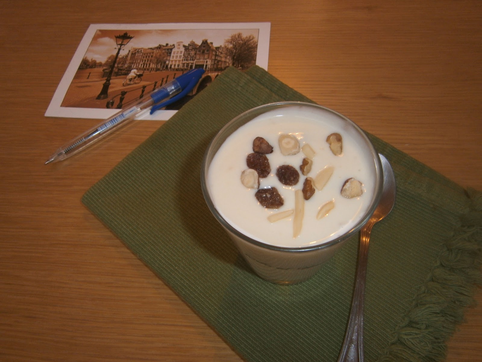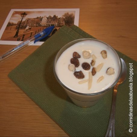 Una vez frío rellenamos unas copas de postre, decoramos con unos frutos secos y terminamos de enfriarlas en la nevera durante un par de horas.