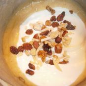 Dejamos enfriar la mezcla y le añadimos el yogurt y los frutos secos (reservamos unos pocos para decorar).