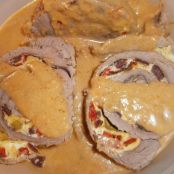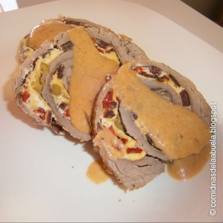Pasamos la salsa por la batidora hasta que nos quede una crema sin grumos y ya tenemos nuestro Rollo de carne relleno de queso y cecina listo para servir.