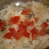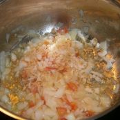 En una cazuela honda sofreímos en aceite de oliva la cebolla picada en juliana, junto al ajo laminado, y el tomate picado fino. Dejamos al fuego hasta que se poche la cebolla.
