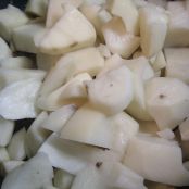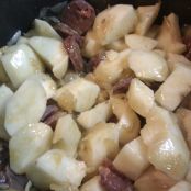 A continuación añadimos todo el chorizo cortado en rodajas y mientras se va cociendo a fuego lento, vamos pelando todas las patatas y las cortamos en trozos grandes