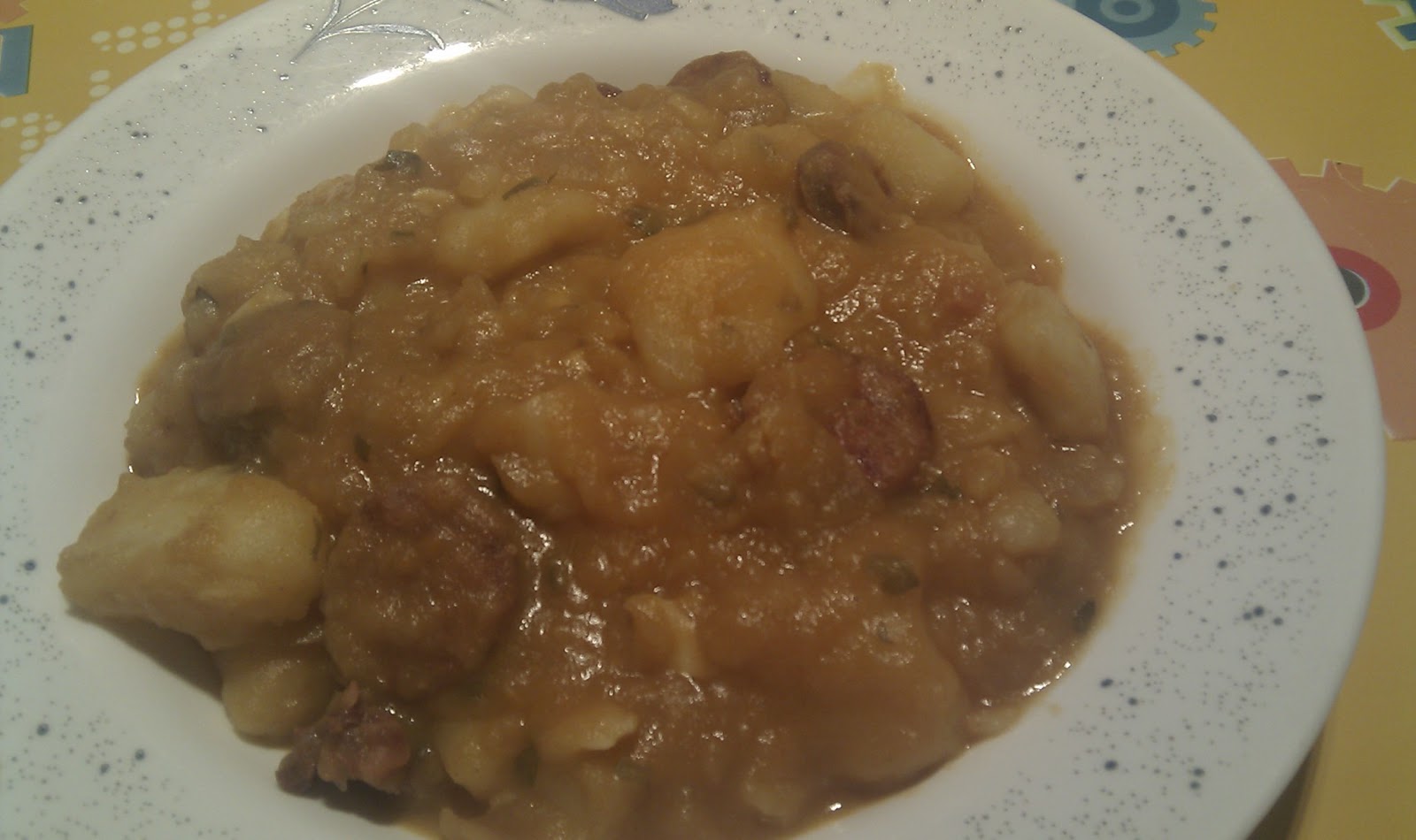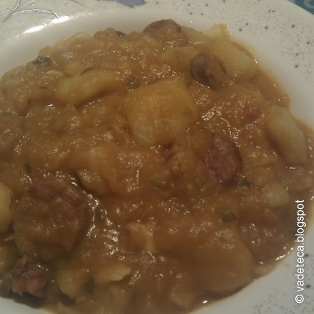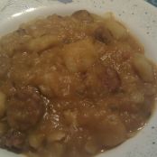Finalmente ya sólo será necesario añadir unos 400 ml de agua caliente, justo para cubrirlo todo y dejarlo hirviendo durante unos 40 minutos, mientras vamos removiendo todo de vez en cuando, para ayudar a salir el almidón de las patatas y de paso a espesar todo.