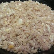 Mezclamos el jamón cocido, el atún y los huevos duros y los pasamos por la picadora. Picamos hasta obtener una mezcla con la que rellenaremos los canelones.