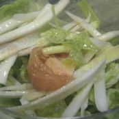 Acompañamos el plato con una buena ensalada, hecha con lechuga iceberg, tomate raff y cebolleta, de aquellas tan dulces. Aderezado con un buen y intenso aceite de oliva.