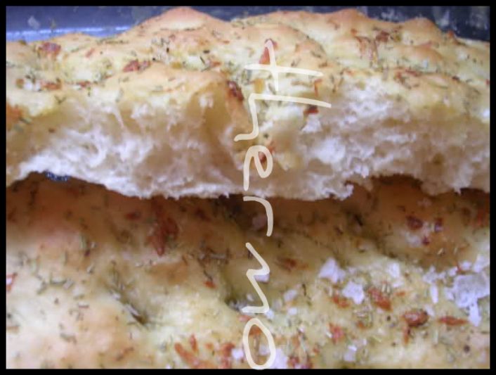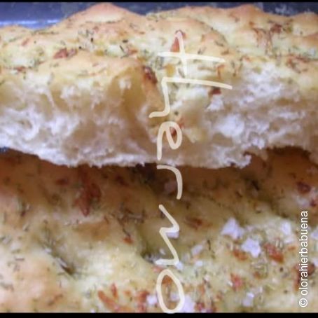 - Cuando ya esté levado, echamos el aceite con el ajo y el romero sobre ellas y vamos metiendo nuestros dedos a la vez que la impregnamos con el aceite, que queden "fositas" llenas de ajo y romero.