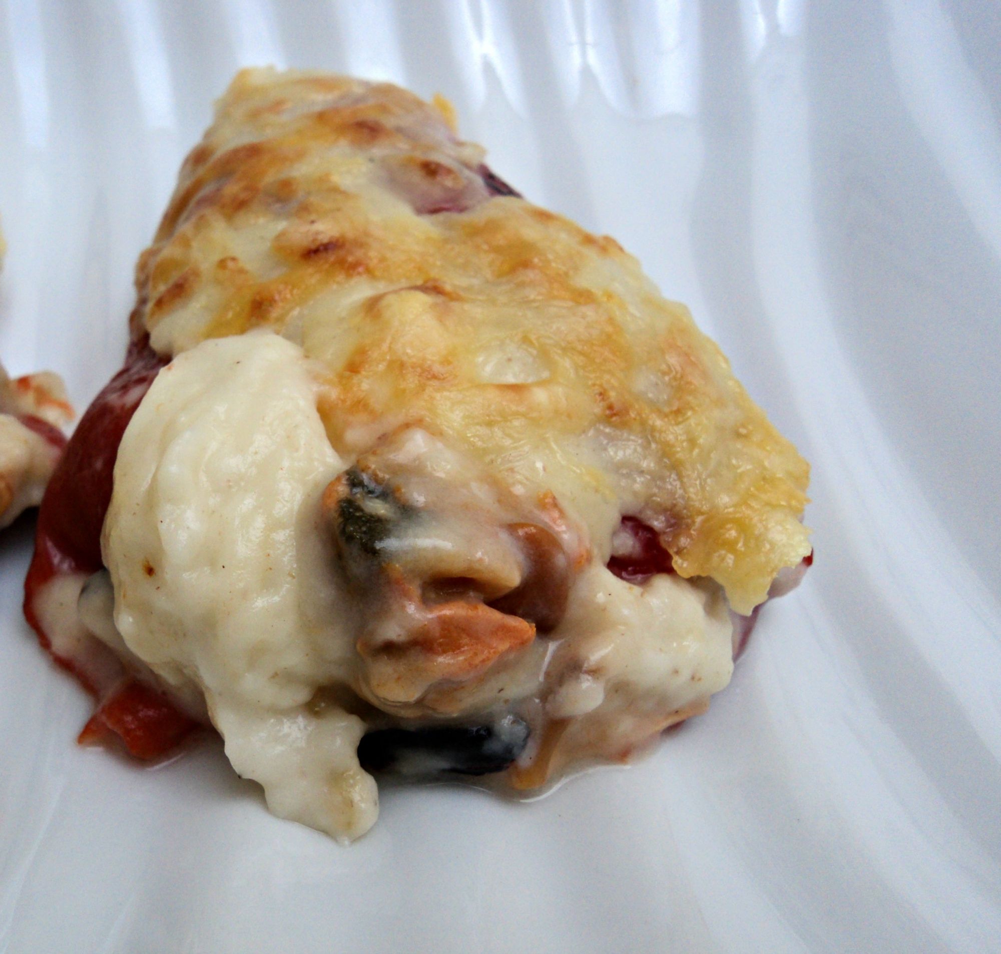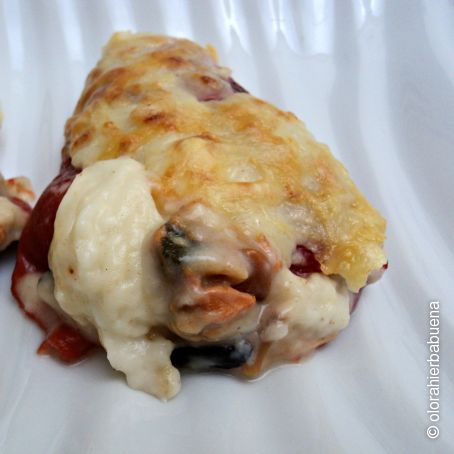- Mezclamos con la mitad de la bechamel los mejillones y los langostinos, añadimos el jugo de los pimientos, rellenamos todos los pimientos y los vamos poniendo en una fuente para horno.