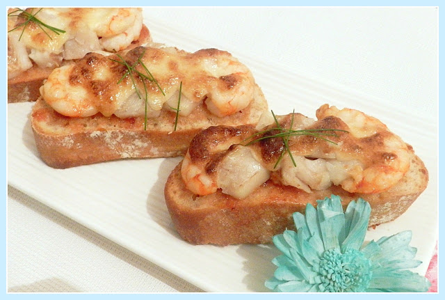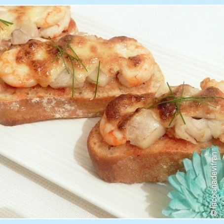 Bruschetta de bacalao y gambones gratinada al alioli y mermelada de tomate