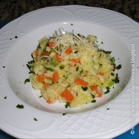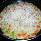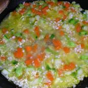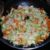 Cortaremos las verduras en taquitos pequeños y los rehogaremos con un poco de aceite, cuando esten ya blanditas las verduras pondremos el arroz y lo removeremos todo bien y le daremos vueltas hasta que el arroz este tramsparente.