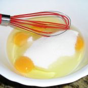 Ponemos en un bol los 4 huevos y el azucar batimos bien hasta obtener una mezcla blanquecina y suave.