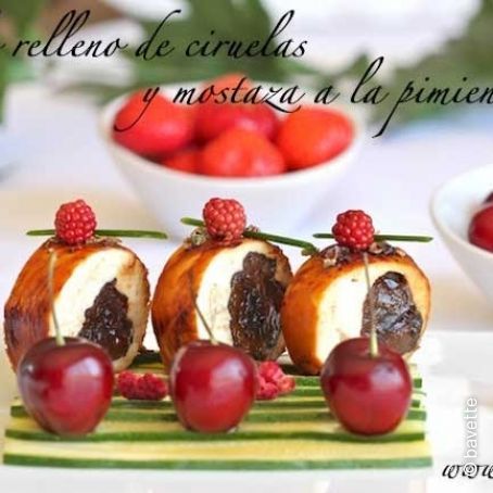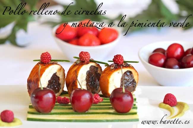 Vamos con unas pechugas de pollo rellenas de ciruelas pasas, con calabacín, frutas, y el acompañamiento que mejor le va, una mostaza a la pimienta verde.