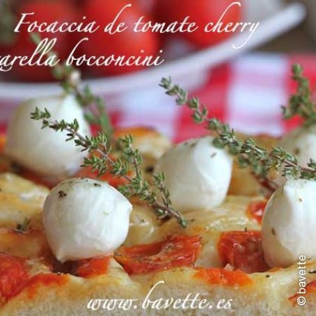 Cuando este lista pintamos la superficie de la masa con aceite de oliva, vamos colocando las rodajas de tomate cherry y esparcimos hojas de tomillo, con el dedo índice vamos presionando ligeramente toda la superficie haciendo pequeñas hendiduras, dejando un espacio entre ellas, tal como se muestra en la foto.