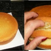 Cortamos el bizcocho en tres discos, ponemos un disco y le emborrachamos con el almíbar un poco y ponemos una buena capa de la nata con el cacao, sobre el disco,tapamos con otro disco, y le ponemos el almíbar, y una buena capa de nata, y tapamos con el tercer disco que volvemos a emborrachar, guardamos en el frigorífico.