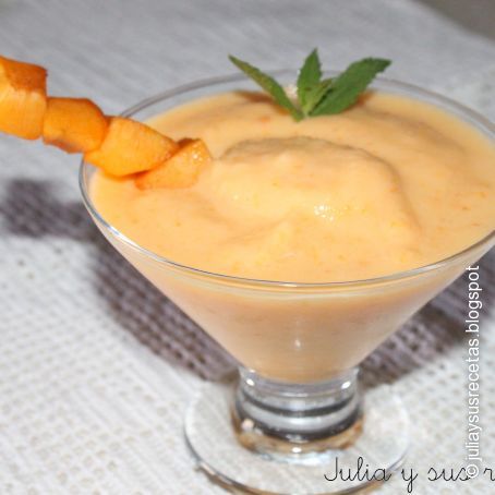 Lo batimos bien y lo servimos inmediatamente con brochetas de melocotón y plátano.