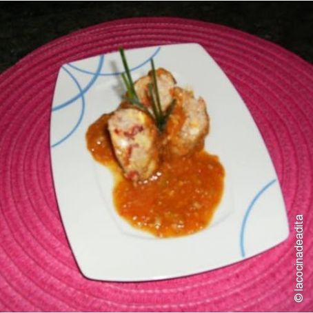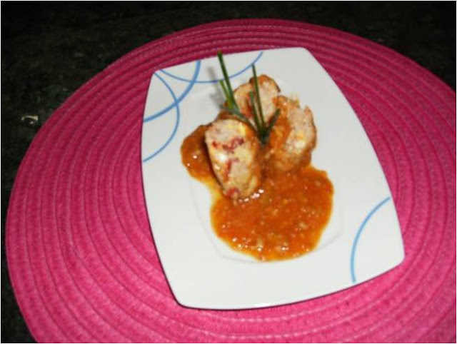 Cortamos la carne en dos un poco sesgada y un trozo mas grande que el otro, le ponemos la salsa por encima se puede adornar con un poco de cebollino y a la mesa esta deliciosa, es una tapa que con mas cantidad vale para un segundo plato, espero que os guste, besos