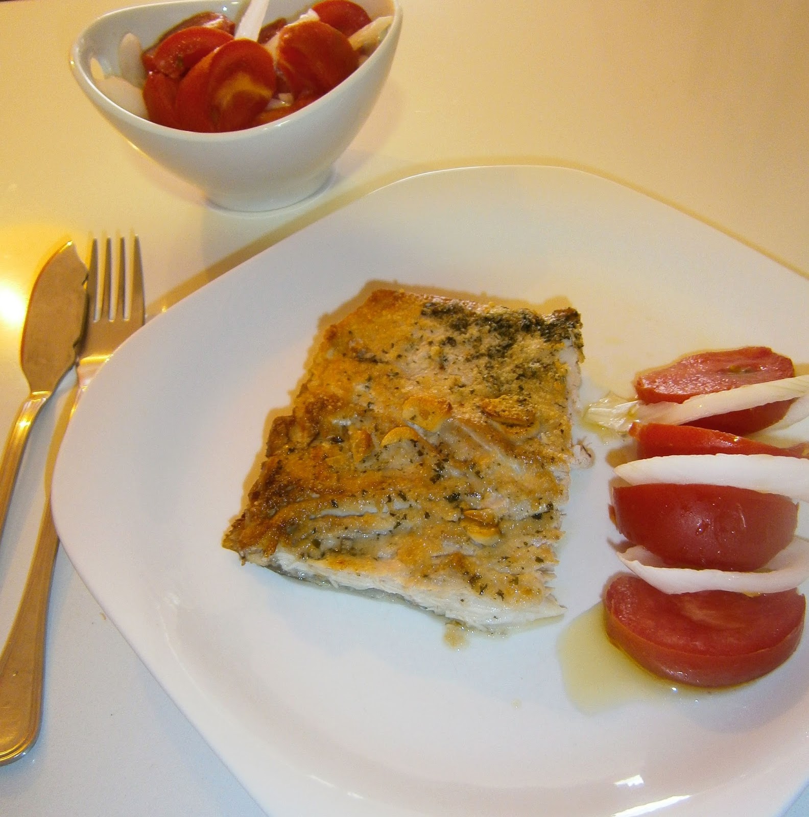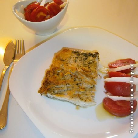 Para acompañarla yo me he decantado por una sencilla ensalada de tomate rojo de huerta. Un poco de tomate, un poco de cebolla, una pizca de sal, aceite, vinagre y listo. También podéis acompañar la ventresca con unas patatas al horno, o unas panaderas fritas. En cuanto a las salsas, una mayonesa o una sencilla salsa alioli le dan un toque muy bueno.