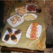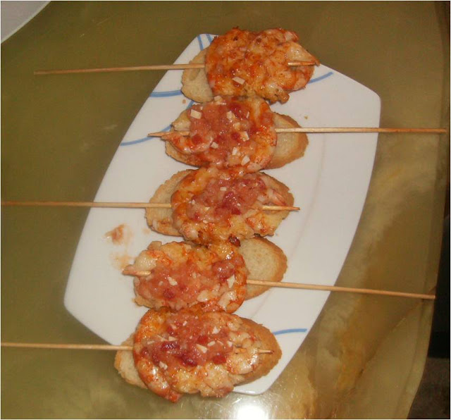 Tostamos unas rebanadas de pan con el grill, ponemos las brochetas encima y sobre estas una cucharada de la vinagreta, y a la mesa son sencillas y una delicia, espero que os gusten
