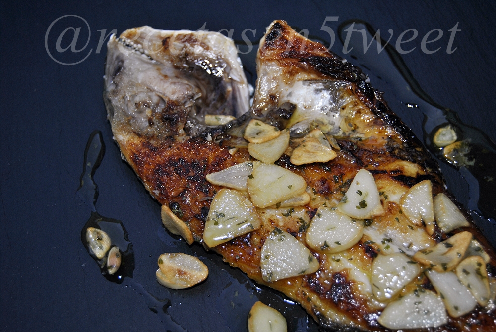 En una sartén pequeña, pon las 5 cucharadas de aceite y dora la cabeza de ajos cortados en rodajas, cuando estén dorados echa el perejil, y la mantequilla, aparta del fuego, y mueve la sartén en círculos para fundir la mantequilla y ligarla con el aceite, añade también el zumo del limón y cubre las doradas con esta salsa, sirve inmediatamente...y disfruta!!!