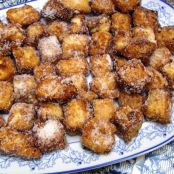 Una vez que ha enfriado un día,cortar en cuadrados, rebozar en un poco de harina y en el huevo batido. Freír en aceite caliente y sacar a un plato con papel de cocina, rebozar en azúcar, dejar enfriar y lista para comer.