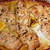 En una bandeja de horno poner las pechugas salpimentadas, rociar un poco de aceite, el vino blanco y el tomillo, partir el limón en tres o cuatro trozos y sin escurrir los ponemos encima (el solo irá soltando los jugos). Poner en el horno a 200 grados unos quince minutos.