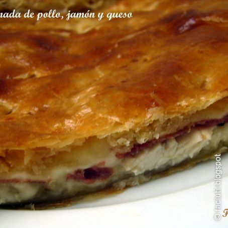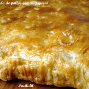 Extender un poco el hojaldre, poner capas de pollo, jamón y queso. Tapar con la otra placa y sellar los bordes con un tenedor.