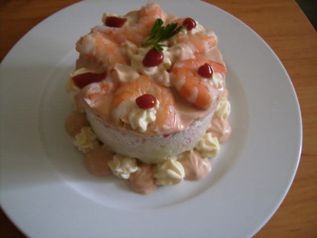 Para cubrir, mezclar las otras dos cucharadas de mayonesa con un poco de ketchup y napar el pastel. Poner unos langostinos enteros , un poco de imaginación para el adorno y listo.