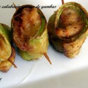 Secar bien las gambas peladas y salpimentar. Enrollar cada gamba en una tira de calabacín y sujetar con un palillo. Mezclar harina y pan rallado, rebozar los rollitos y freír en abundante aceite caliente hasta que estén dorados. Ponerlos sobre papel de cocina para que absorba el aceite y servir calientes.