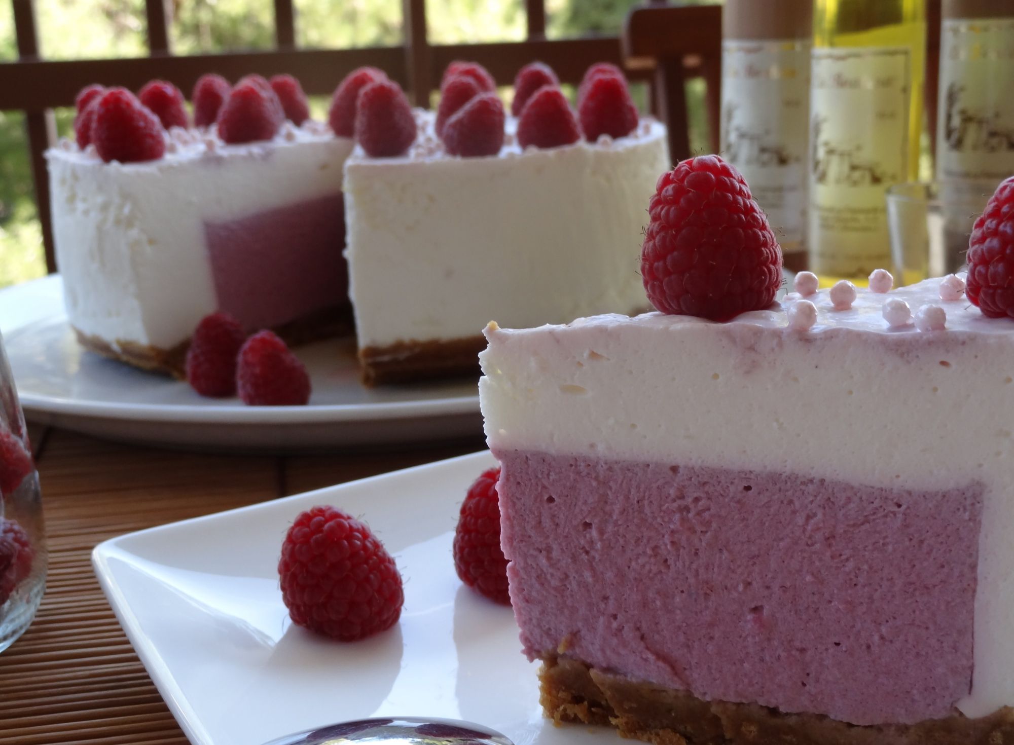 En el molde de 24cm poner el bloque de frambuesas en el centro, sobre la base de galletas. Sobre esta verter la crema blanca.