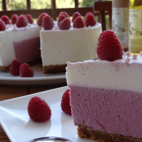 - 300g de frambuesas- 70g azúcar- 4 hojas de gelatina- 1 yogur natural- 100g phidadelphia- 2 c/s agua- 200ml nata- 4 c/s agua- molde 20 cm