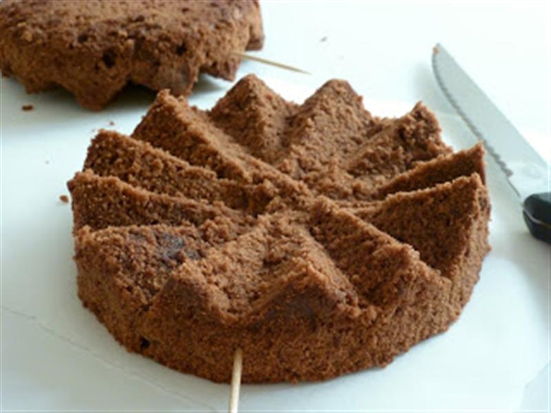 Cuando esté frío lo cortamos en zig-zag. Separamos las dos capas poniendo un palillo para marcar. Mojamos con el zumo de naranja ambas partes.