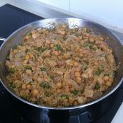 Agregamos los garbanzos (enjuagados y escurridos), la pimienta negra y el perejil picado. Si fuese necesario rectificamos la sazón y removemos con cuidado de no romper los garbanzos.