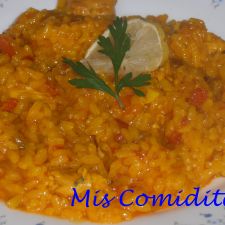En una paellera echamos el aceite. Cuando esté caliente añadimos el pollo y lo rehogamos. Incorporamos el arroz y lo removemos durante dos minutos o hasta que se vuelva transparente.