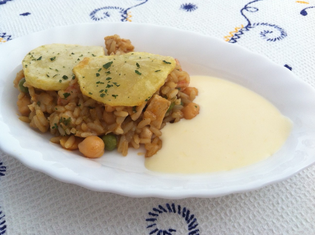 Una paella muy completa con arroz y garbanzos acompañada de patatas fritas a rodajas y alioli.