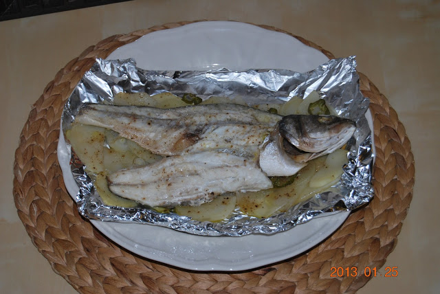 5º colocamos el pescado encima y de nuevo le echamos un poquito de aceite,sal y pimienta