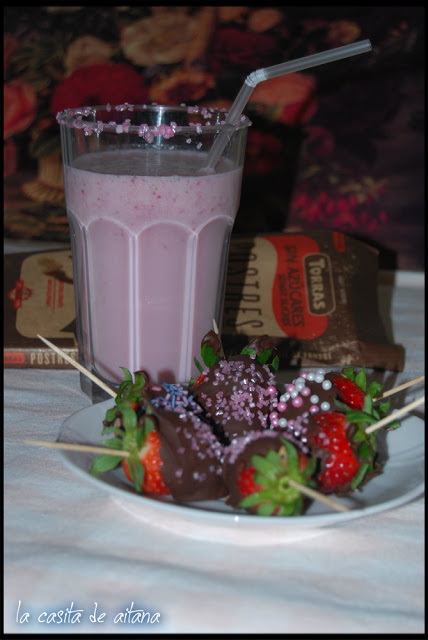 1º fundimos el chocolate y ponemos palillos a las fresas,luego las bañamos de chocolate y ponemos decoración por encima,meter en la nevera hasta que se ponga duro el chocolate.