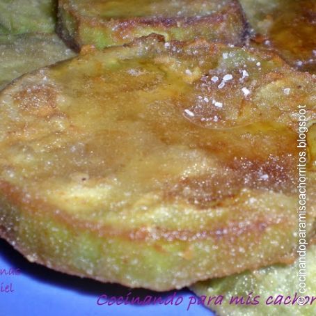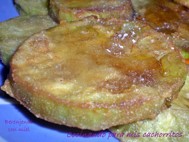 Disponemos las rodajas de berenjena ya fritas sobre el tomate frito y regamos con el resto de la miel.