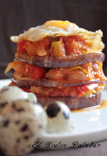 Ya tenemos todo listo para emplatarlo! y ahora lo hacemos de la siguiente manera: Colocamos en el centro de un plato una rodaja de berenjena asada, a continuación ponemos pisto, otra rodaja de berenjena, volvemos a poner pisto y asi hasta tener la altura deseada, yo creo que tres pisos es suficiente, terminando siempre con pisto. Como colofón ponemos el huevo de codorniz que hemos frito, ya que es muy tradicional coronar un buen pisto con un huevo, no he querido faltar a la tradición en este aspecto.