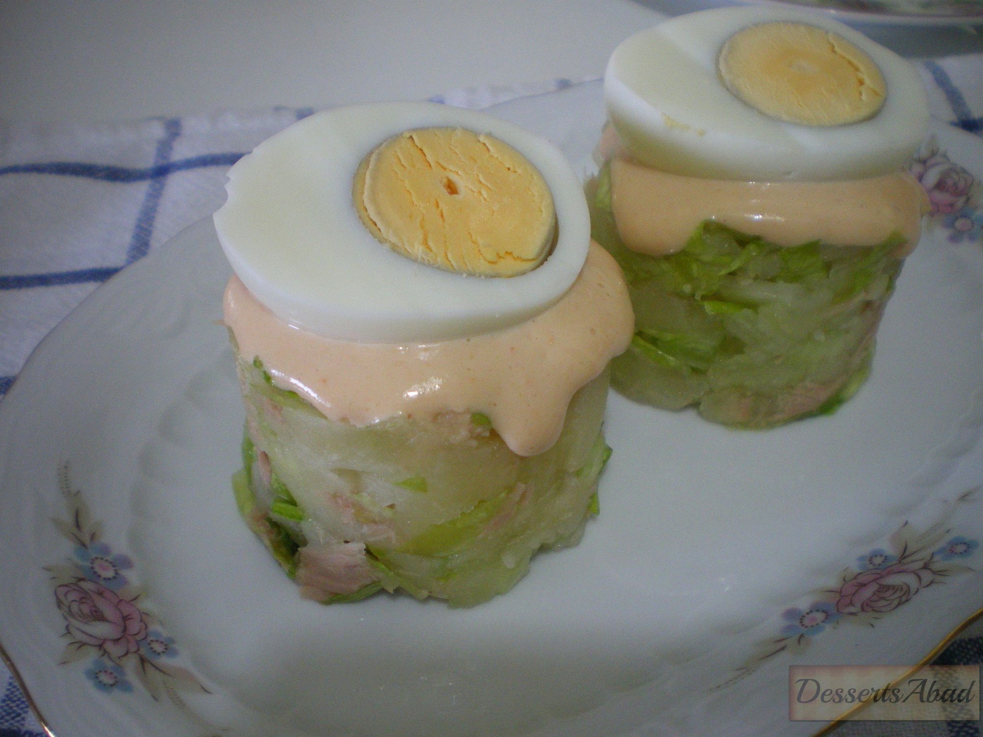 Monta el pastel.En un cilindro metálico hueco, ponemos la pasta de patatas alternando con la mezcla de cebolla, atún, apio y lechuga.Terminamos con la pasta de patatas.Adornamos con la salsa rosa y ponemos medio huevo cocido para rematar la faena.¡¡Buen provecho!!
