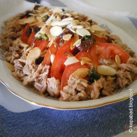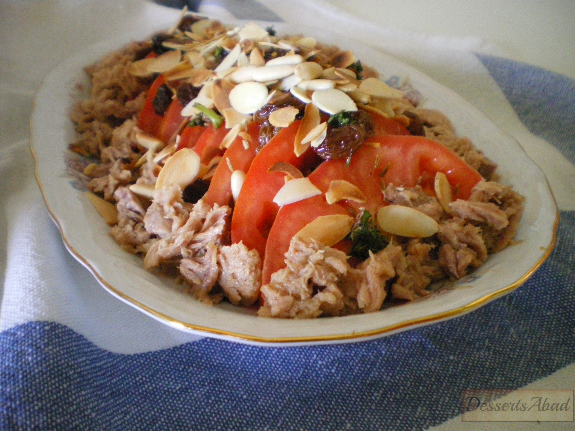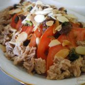 Exquisita ensalada de tomates en rodajas aderezados con una vinagreta de pasas al vino Pedro Ximénez y adornado con almendras fileteadas.
