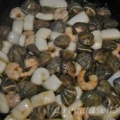 Vale, ya está todo listo, es mucho más sencillo de lo que parece, pon la paellera al fuego, añade un chorro de aceite y los ajos picaditos, cuando estén dorados echa los calamares y las gambas peladas, deja que doren bien, añade las chirlas, rehoga un poco.