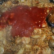 Echa el arroz, rehoga mezclando bien para que se impregne del refrito, añade el pimentón, mezcla rápido para que no se queme y añade enseguida el tomate rallado, mezcla todo con cuidado de no permitir que se queme el pimentón.