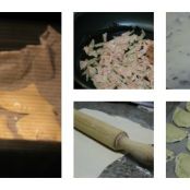 Ahora cogemos la lámina de hojaldre y ponemos un poco de harina sobre la base en la que se vaya a trabajar, también se le pone un poco al rodillo, para que no se quede pegada. Estiramos un poco la masa con el rodillo. Cortamos círculos de masa, rellenamos la mitad del círculo con la salsa (ya fría), cerramos y le hacemos pequeños adornos con un tenedor, además sirven para sellar bien la empanadilla. Así sucesivamente, con toda la masa que tengamos.