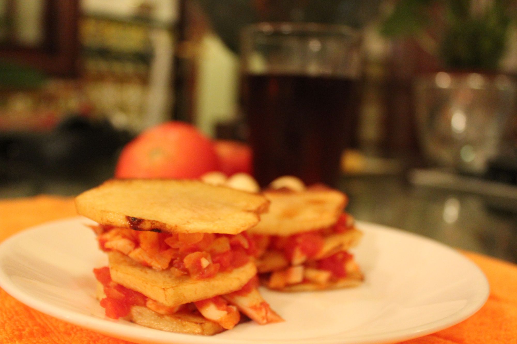 Ahora pasamos al emplatado. Ponemos una rodaja de patata, encima relleno (con ayuda de una cuchara), encima otra patata; y así sucesivamente hasta que queramos.