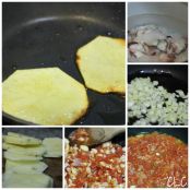 Cuando la cebolla y el ajo están bien dorados, echamos el tomate y dejamos sofreír a fuego medio. Le echamos un poco de sal y una cucharadita de azúcar. Removemos de vez en cuando para que no se nos pegue. Ahora vamos a pelar la patatas, y las vamos a cortar en rodajas finas. Les echamos sal y las hacemos a la plancha (en una sartén con un poco de aceite de oliva). Reservamos.