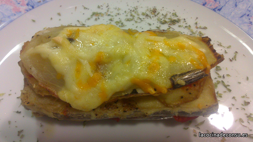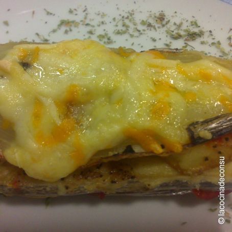 Ahora montamos todo,poniendo en primer lugar la berenjena, luego el calabacin,y por último el pimiento,así repetiremos de nuevo para montar las capas terminando con berenjena .Echamos el queso rallado por encima y al horno a 180 grados unos 10 minutos.