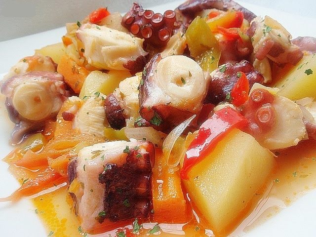 - Cinco minutos antes de acabar la cocción, añadimos el pulpo cortado.Meneamos la olla con cuidado para mezclarlo bien al guiso.