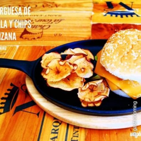 Una mezcla explosiva en cuanto a sabores, esta hamburguesa te dejará más que atónito, anonadado, sorprendido, estupefacto, catatónico, pasmado, patidifuso, petrificado, bueno, te quedó claro ¿no?, seguro que te va a gustar, cumple todos los requisitos de un éxito gastronómico asegurado, además de sorprender y reventar los paladares de tus familiares y amigos. Es la antiversión de la comida rápida aunque no lo parezca, un sándwich slow food en toda regla, con unos toques mediterráneos, además de unos saludables y crujientes chips de manzana hechos al horno, con cero grasas, que serán un acompañamiento perfecto para semejante aventura alimenticia y para completar tu menú, solo falta el colofón, un enorme vaso de sangría o un refrescante tinto de verano, ahora sí es un verdadero spanish meal.