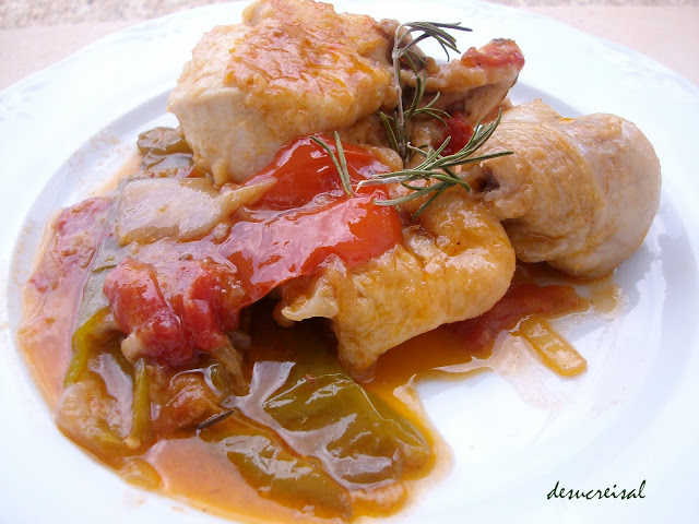 pochar todas las verduras....primero los pimientos y la cebolla y al final el tomate..,cuando esten blanditas .echar el pollo...el ramillete de hierbas..